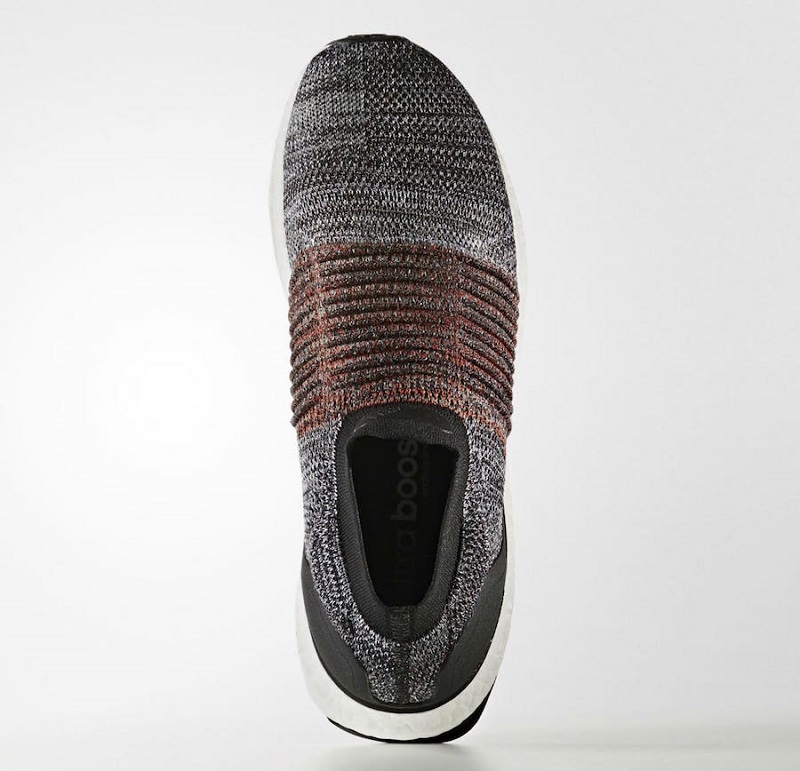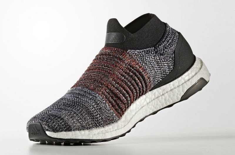 The Adidas Ultra Boost Laceless Core Black features an “Oreo” Primeknit upper with orange detailing and a comfortable sock-like collar.