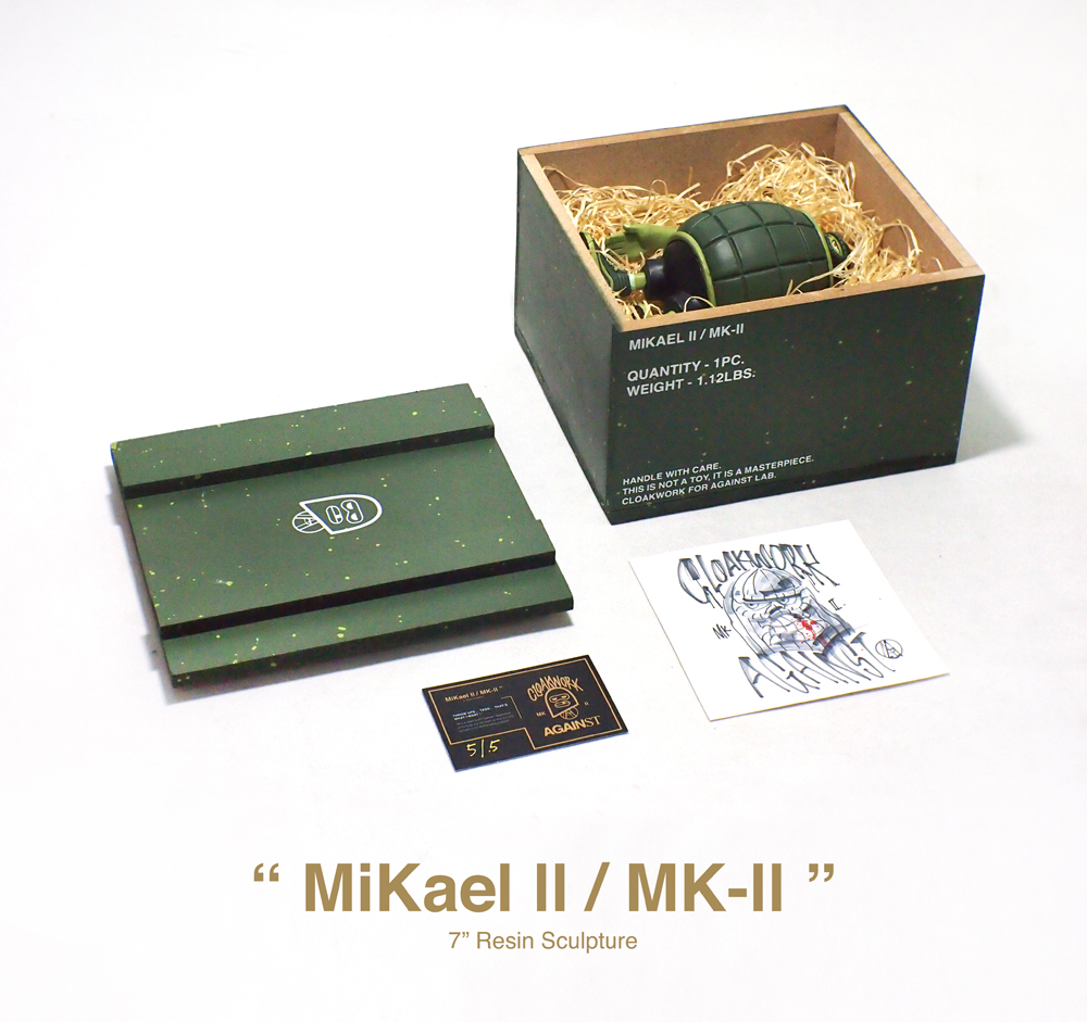 “My very first self-designed resin sculpture marks a milestone in my career as a full time graffiti artist/illustrator. It’s a character created by combining a spray can and a MK-II hand grenade,” said Cloakwork.