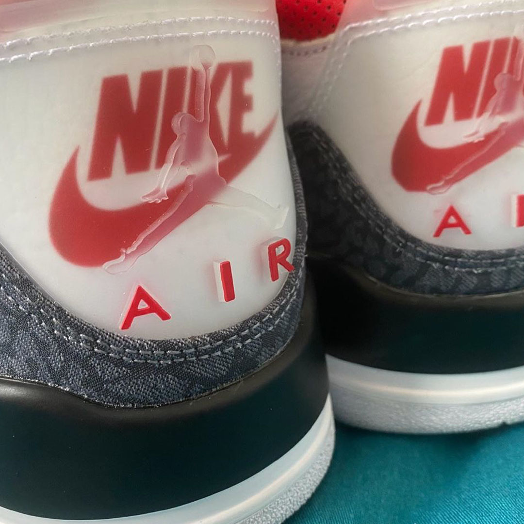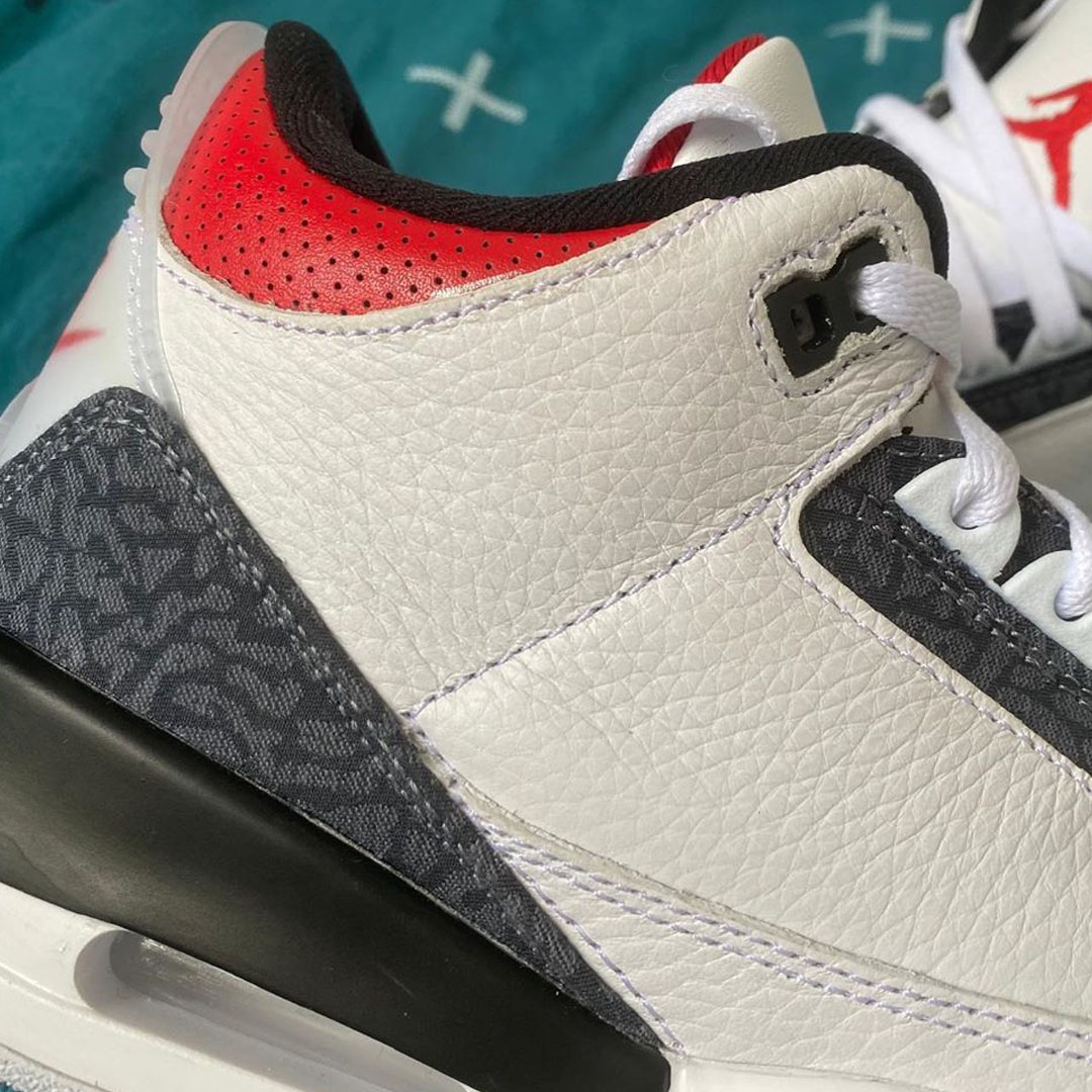 The sneaker is based on the “Fire Red” colorway that dropped in 2013. The Air Jordan 3 SE “Fire Red” will come with a white leather upper and denim elephant print accents in place of leather. An additional denim elephant print accent is added around the lace eyelets.