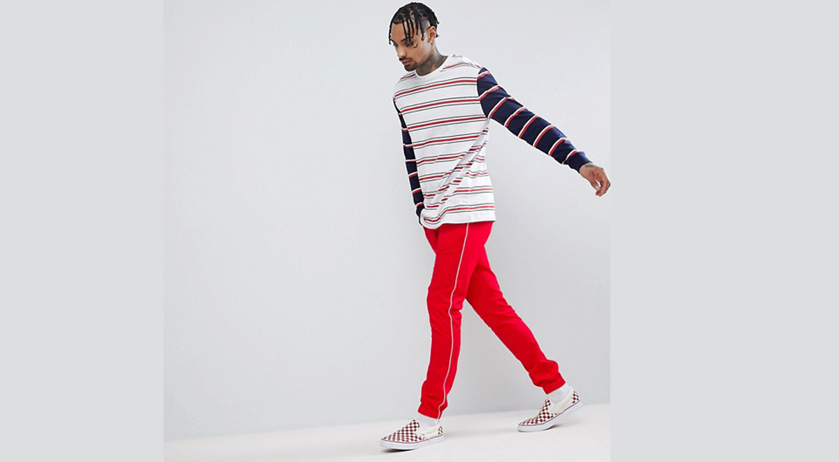 Shop the ASOS Skinny Joggers In Red With White Piping.