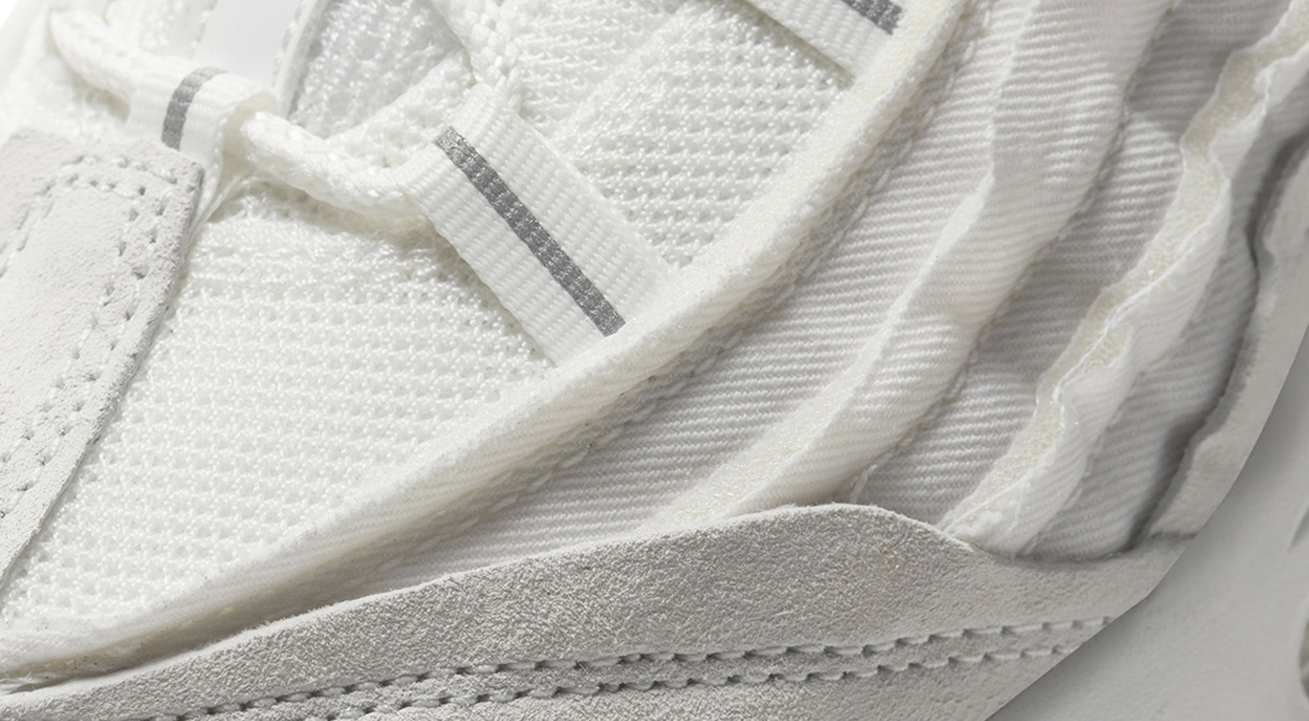 Instead of the smooth leather and suede uppers we are all familiar with, the sneaker is wrapped with tulle fabric that reveals glimpses of the foam tubing underneath. This aesthetic fits perfectly with the rest of the Homme Plus collection. The sneaker comes with classic midsoles in matching white or black.