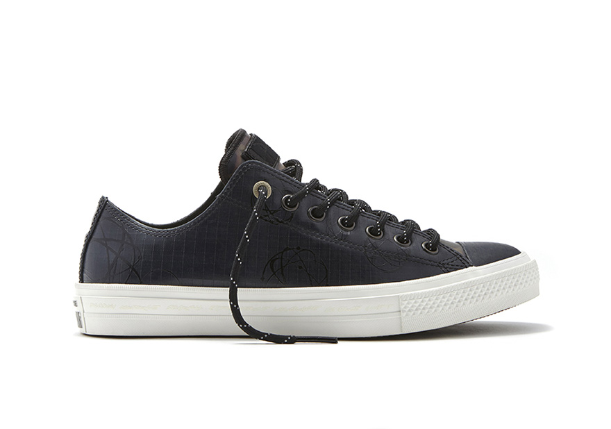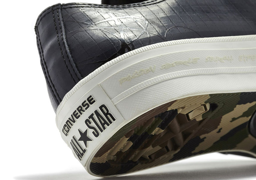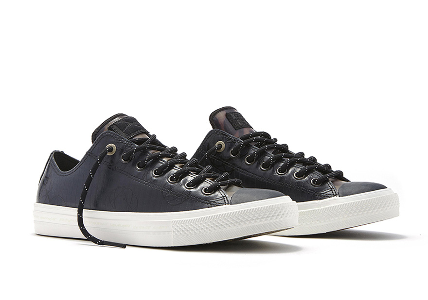 Converse’s latest Chuck Taylor All Star II, already known for its marked improvements over its predecessor, is the silhouette of choice, with both the high and low-top versions receiving weatherized upper rubbers and an abstract camouflage pattern that’s Futura’s signature style.