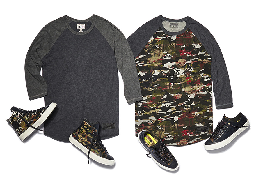 Complementing the sneakers is an apparel collection that includes raglan t-shirts with Futura’s signature graphic and camo prints, as well as a ski mask with a reversible Converse camo pattern.