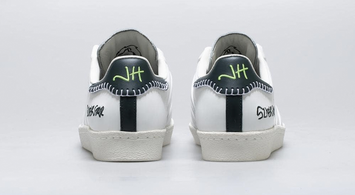 The Jonah Hill x Adidas Superstar exudes a rough, deconstructed vibe. Instead of the usual stitched-on three stripes, the sneaker comes with three embossed stripes on each side. The classic “Superstar” text is replaced with a version likely modeled after Jonah’s handwriting.