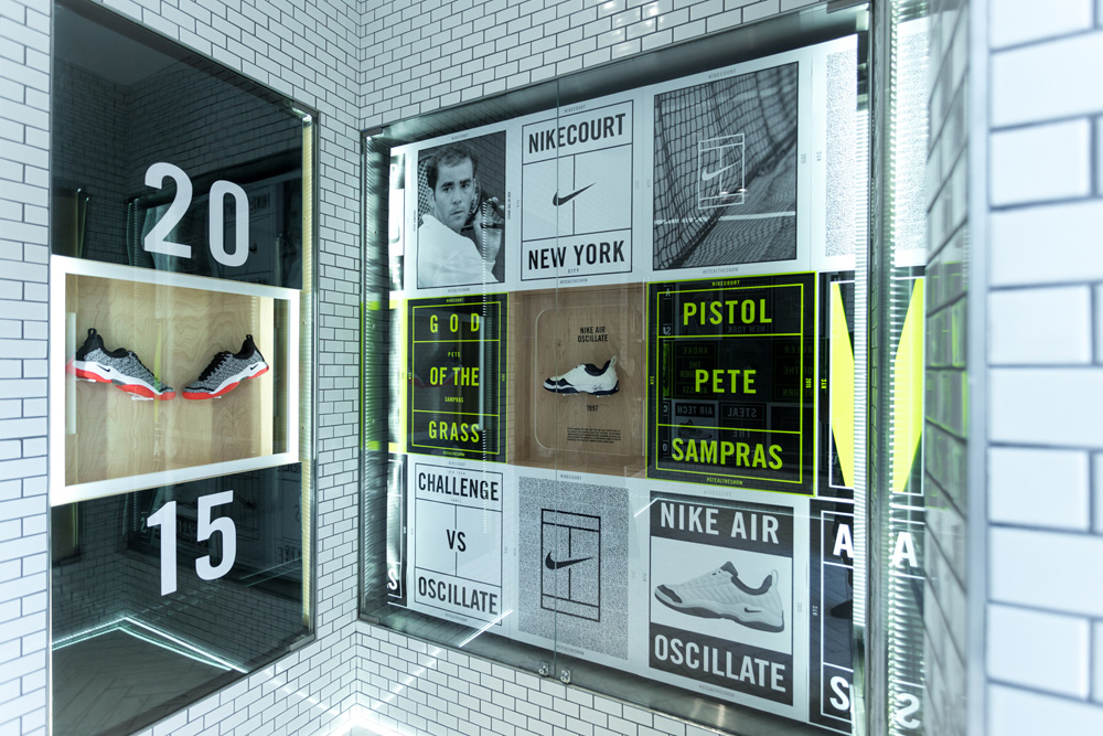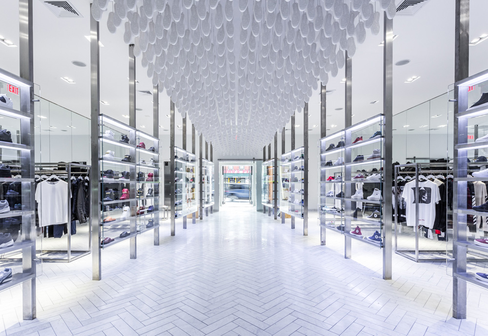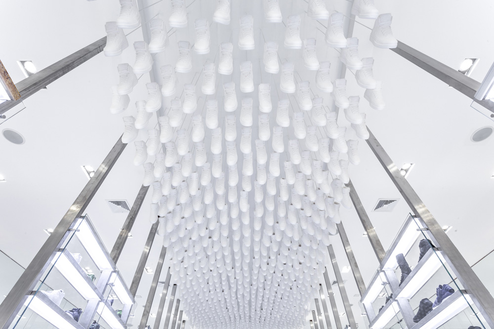 Hundreds of all-white Jordans dangle from the ceiling, and the main sales area has sneakers displayed in rows of freestanding stainless steel fixtures. Infinity mirrors and marble herringbone-patterned flooring lend a premium touch and complete the store’s futuristic look.