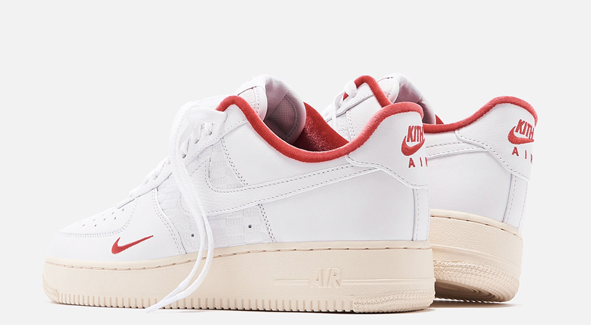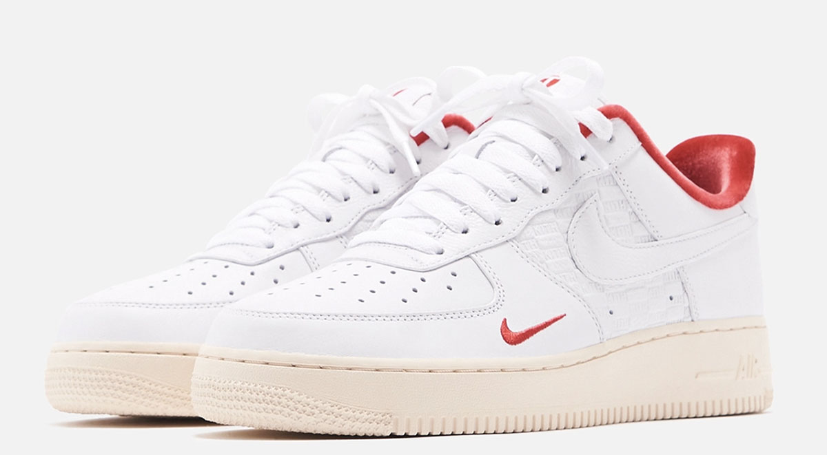 The Kith x Air Force 1 comes with a New York standard white leather upper. The sneaker boasts a lush red velvet sock liner with a color-matched insole – truly a striking contrast. The forefoot’s mini Swoosh, heel tab branding and tongue tab provide additional pops of red. All of these sit on top of a cream outsole.