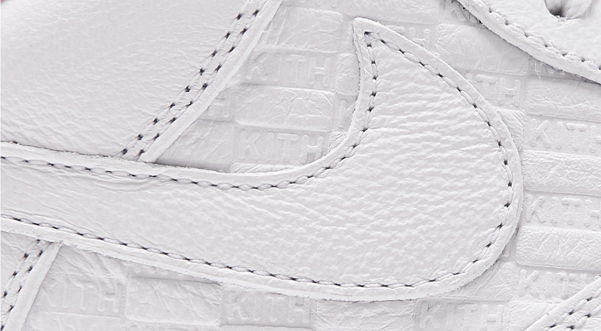 The sneaker will come with “Kith Air” branding, replacing the usual Nike branding found on the insole and heel tab. Another bit of Kith branding can be found on the midfoot panel, where the logo forms an oblique pattern embossed on the leather.