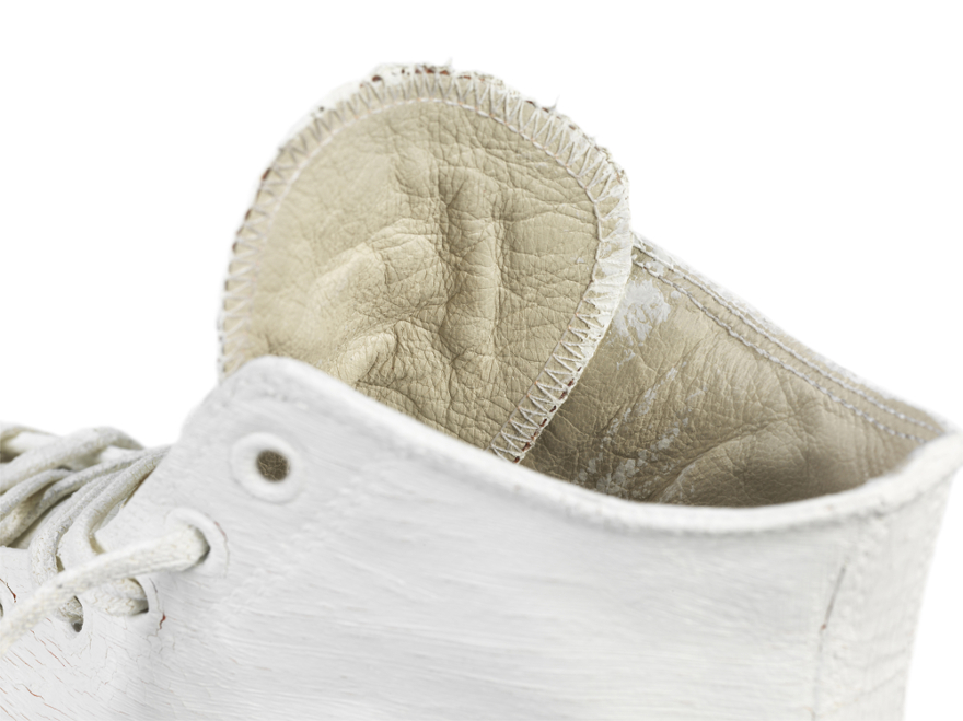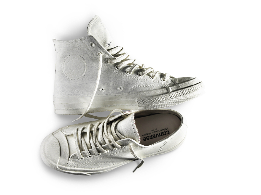 As the sneakers are gradually worn in, the white overpaint loosens and cracks, revealing the leather upper beneath that’s in Converse’s original heritage colorways: Amber Glow or True Navy for the Converse All Star Chuck ’70, and Azure Blue or Biking Red for the Converse Jack Purcell. Additional features include a discreet Maison Martin Margiela logo on the tongue, as well as painted or non-painted lace options.