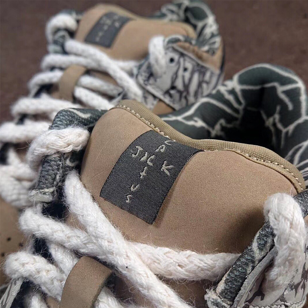 The new Travis Scott x Nike SB Dunk Low bears some similarities to its predecessor. The sneaker switches out the flannel pattern for a brown leather base with grey Realtree like print overlays. Unlike the previous SB Dunk, these overlays do not seem to be removable. Contrasting black Swooshes (not pink ones this time) have been added to the sides of the sneaker.