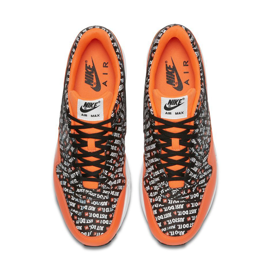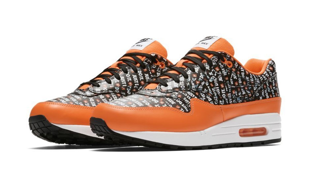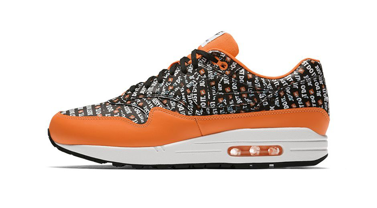 For the men’s Air Max 1 Premium, the mudguard, tongue, Air unit and inner parts of the shoe will take on a bold orange color, finished with a white midsole. The remaining sections of the sneaker will appear in black, overlaid with an all-over print of the famous tagline.