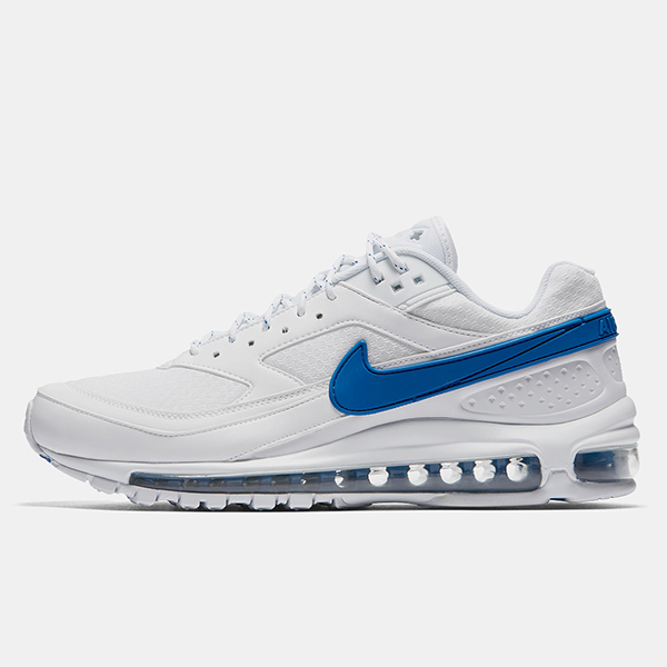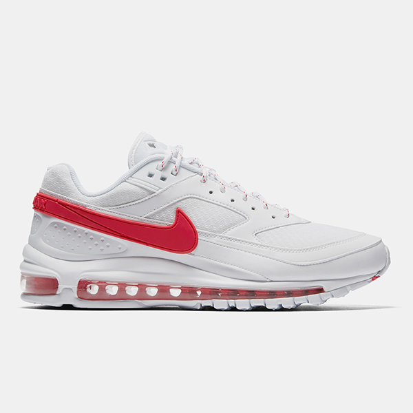 The sneaker comes in a clean white upper with touches of one other color added to each side of the shoe. The left pair of the sneaker features the color blue on the Air Max bubble as well as on the lateral Swoosh that extends and wraps around the heel right to the medial Swoosh. The same goes for the right pair with the only difference being the color red in place of blue.