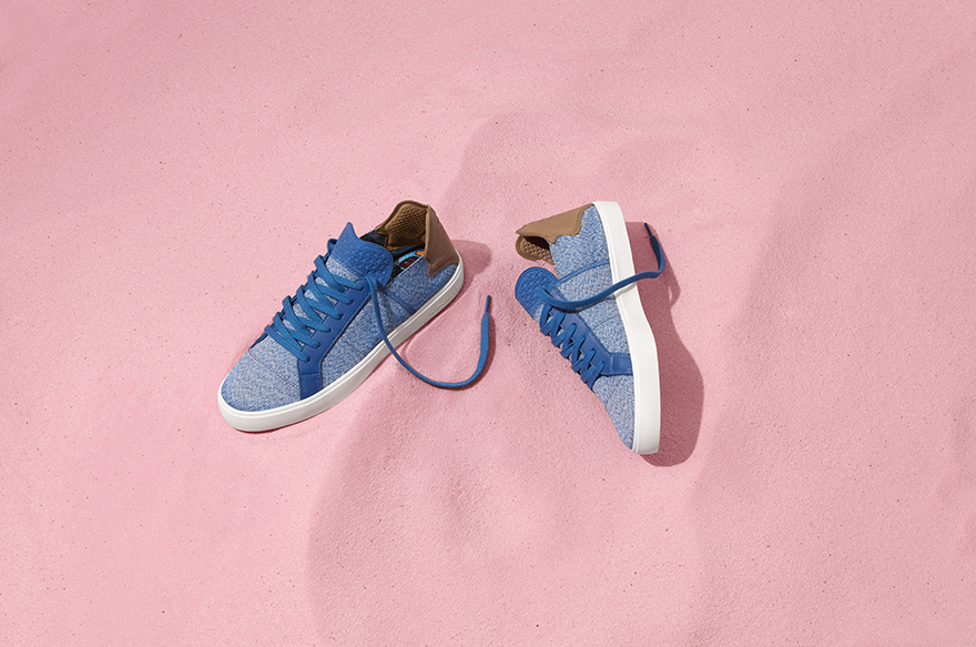 Besides the apparel, the collection boasts slip-on and lace-up sneakers in sky blue and sand grey hues. The shoes feature stretch patched-tape uppers, molded nubuck heels and psychedelic drawings of the human foot.