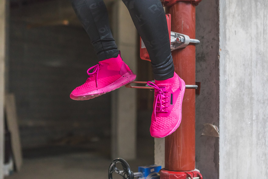 Another key style in the Fall/Winter ’17 line up is the ZOKU RUNNER, a new silhouette introduced this year. The shoe, featuring ultraknit technology, is Reebok’s first foray into knit material. Jasper sports the lightweight and comfortable ZOKU RUNNER ISM in black.