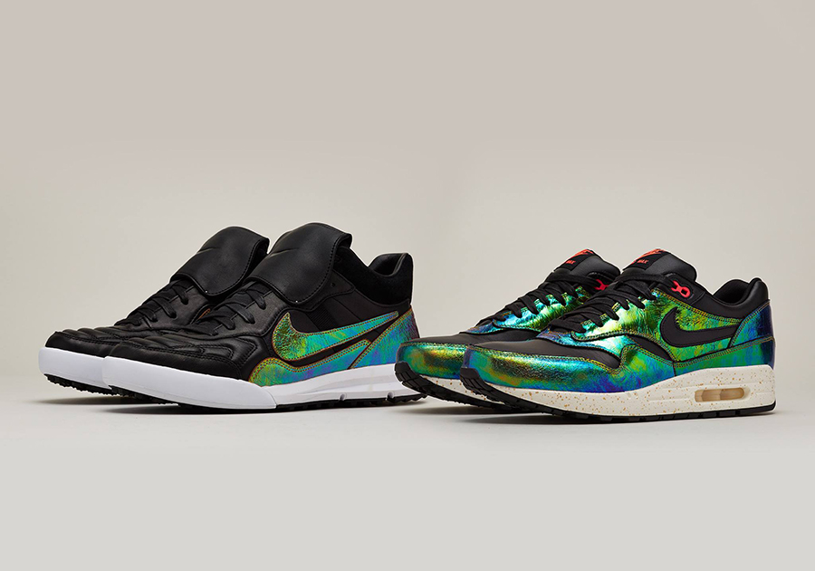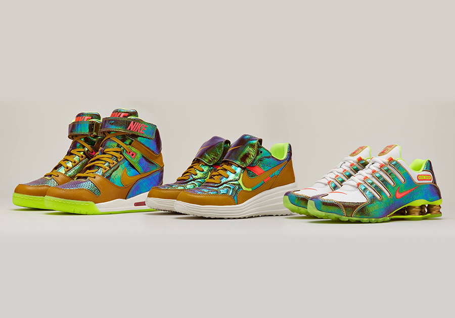 Nike is riding on the wave of the current FIFA World Cup fever and has found the perfect time to release its Nike Sportswear Trophy Collection. This exciting release consists of seven sneakers and utilizes iconic silhouettes such as the Air Max 1, Air Trainer SC High, Lunar Tiempo ’94 Mid and Air Revolution Sky Hi. Each and every shoe features matte leather uppers in white, black or tan, contrasted by shimmery multi-colored foil accents that makes the shoe (and wearer) stand out.