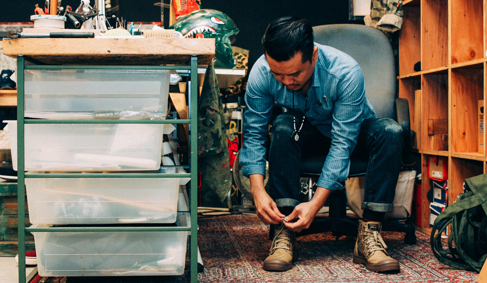 The beginnings of the collaboration can be traced to the end of 2013, when Hommy Diaz, Global Product Director at Palladium and a friend of SBTG, suggested working on a collection together. SBTG agreed and the rest, as they say, is history. “I love the look of the Palladium boot and its olive color. The brand’s aviation roots and subsequent evolution also resonates seamlessly with me. I didn’t want to change their classic look, yet I wanted my own signature touches on the classics. Hence we did a subtle, tone-on-tone pattern on the shoes,” said SBTG.