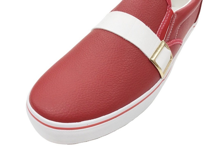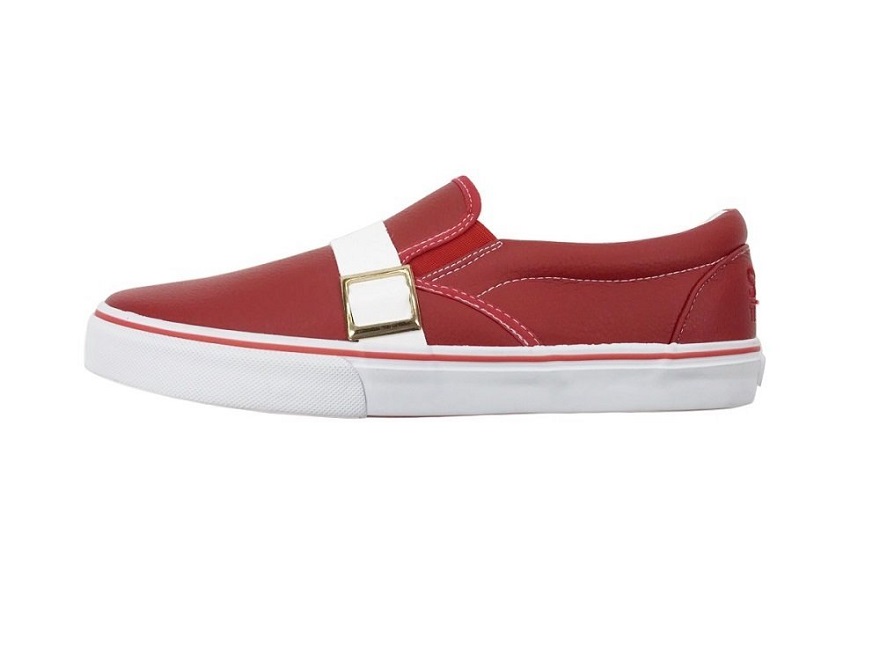 The red leather slip-ons feature an embroidered heel branding with matching white straps and midsole.