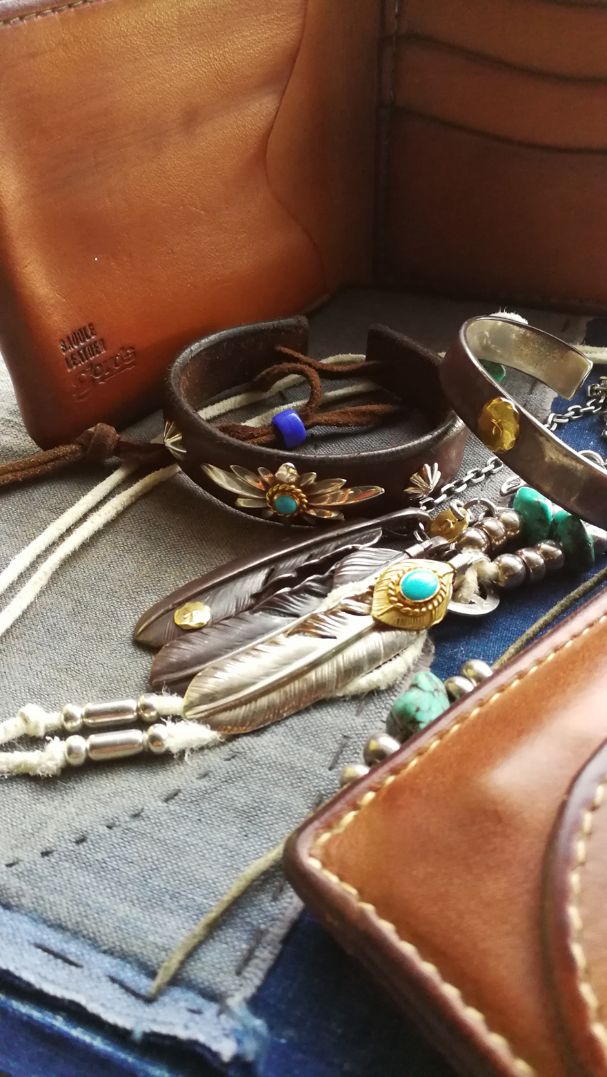 The Top Gold Turquoise XL Feather and Gold Top Turquoise Leather Bracelet. These are my favorites because both are part of a matching set, and also I spent six days queuing in Tokyo last year for them. I spent lots of sweat and tears on this set.