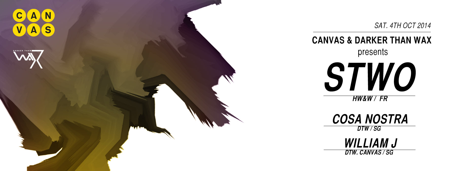 In keeping with the Darker Than Wax (DTW) credo, “we move”, you will be moving when William J (DTW/Canvas), Cosa Nostra (DTW), and STWO (HW&W) perform at Canvas this Saturday, October 4th.
