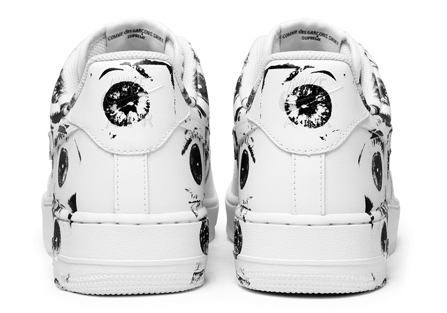 The Supreme x Comme des Garçons x Nike Air Force 1 features an all-white leather upper with printed eye graphics on the side and heel.