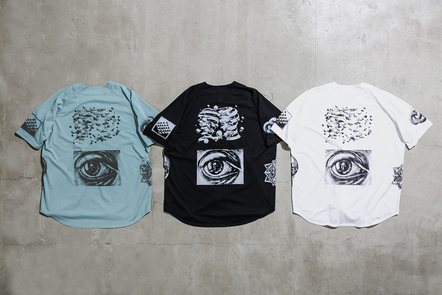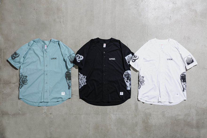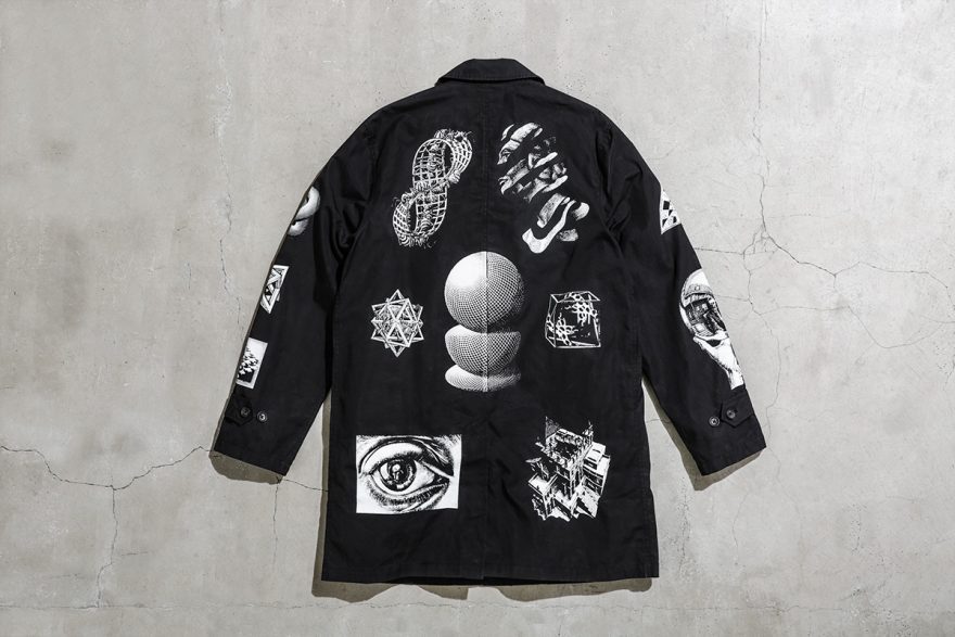 The collab will feature a wide range of graphic t-shirts, shorts, outerwear, and accessories. Some notable pieces include the Supreme x M.C. Escher trench coat as well as the Supreme x M.C. Escher baseball jersey (pictured above). Each piece will feature M.C. Escher’s mind-bending graphics, such as “Relativity”, seen on the bottom left of the upcoming trench coat.