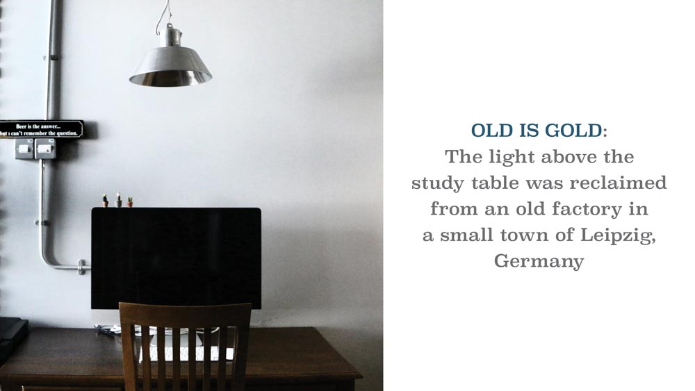It’s not hard to see the light in this home. The home is well-furnished with vintage lights sourced from all over the world that cost from S$300 to S$700 each. Worthy mention goes to the exquisite antique pendant lights above the TV console from Northern England, reclaimed from an old disused hospital. The standing lights beside the 3-seater sofa were sourced during a trip to Penang. Don’t even make the couple pick their favorite piece – they like them all.